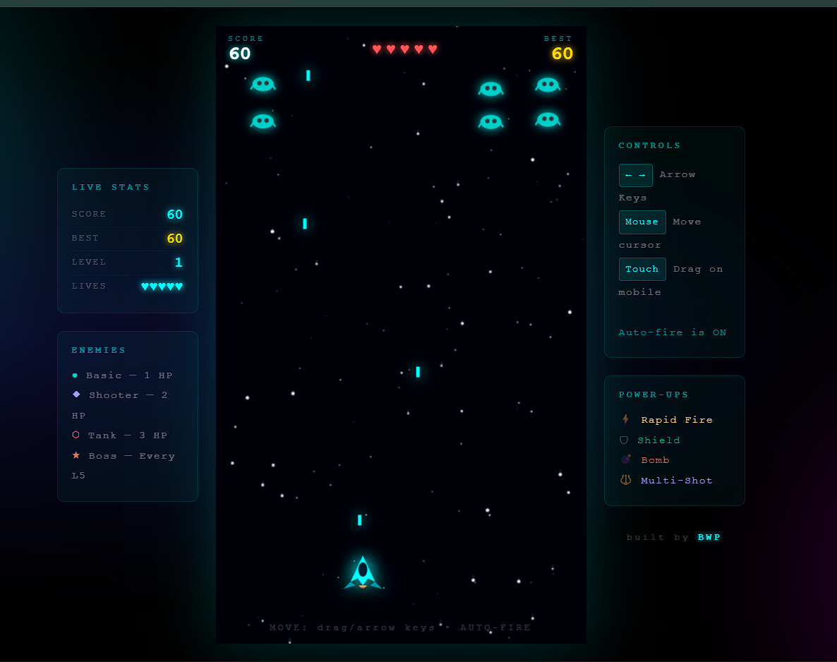 Move your ship with Mouse or Arrow Keys — your ship fires automatically! Dodge enemy bullets, destroy aliens, and collect power-ups to survive as long as possible.